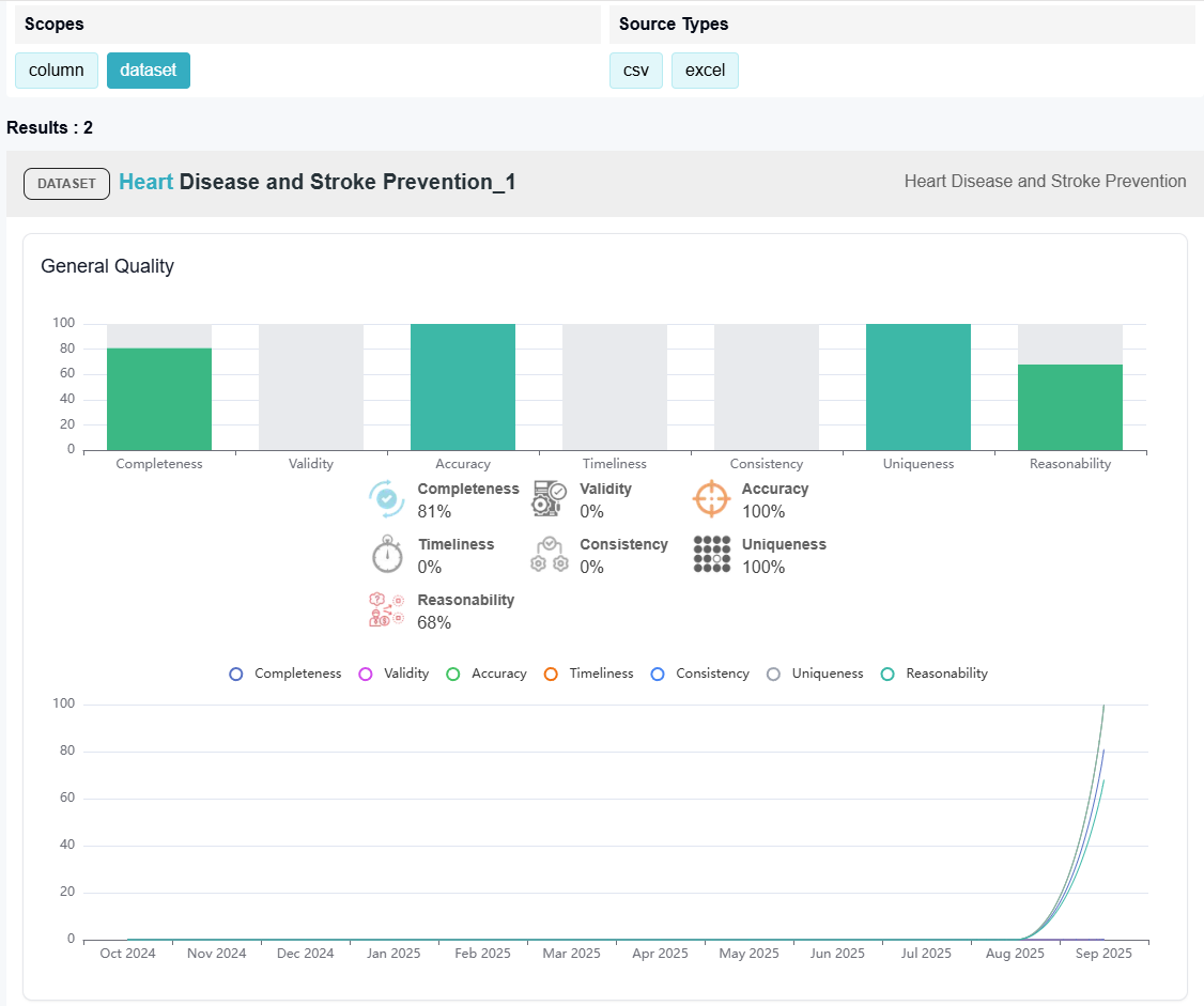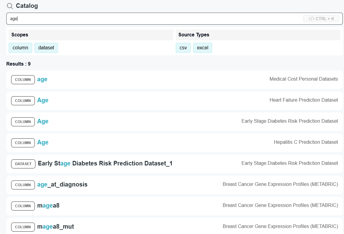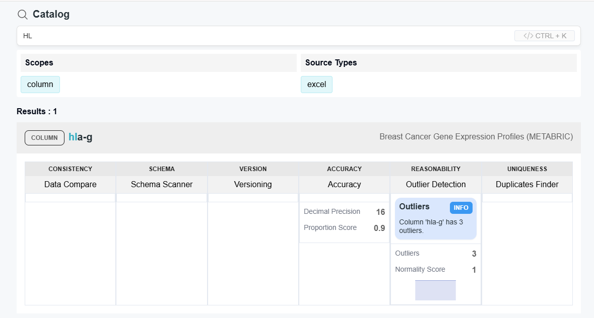 Search results in the catalog come with metrics that provide an overview of data quality.