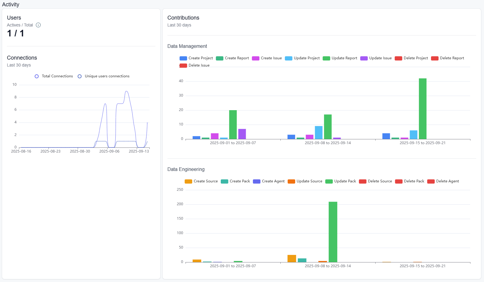 KPI metrics on user activity, Projects, issues, sources, reports, pack, agents